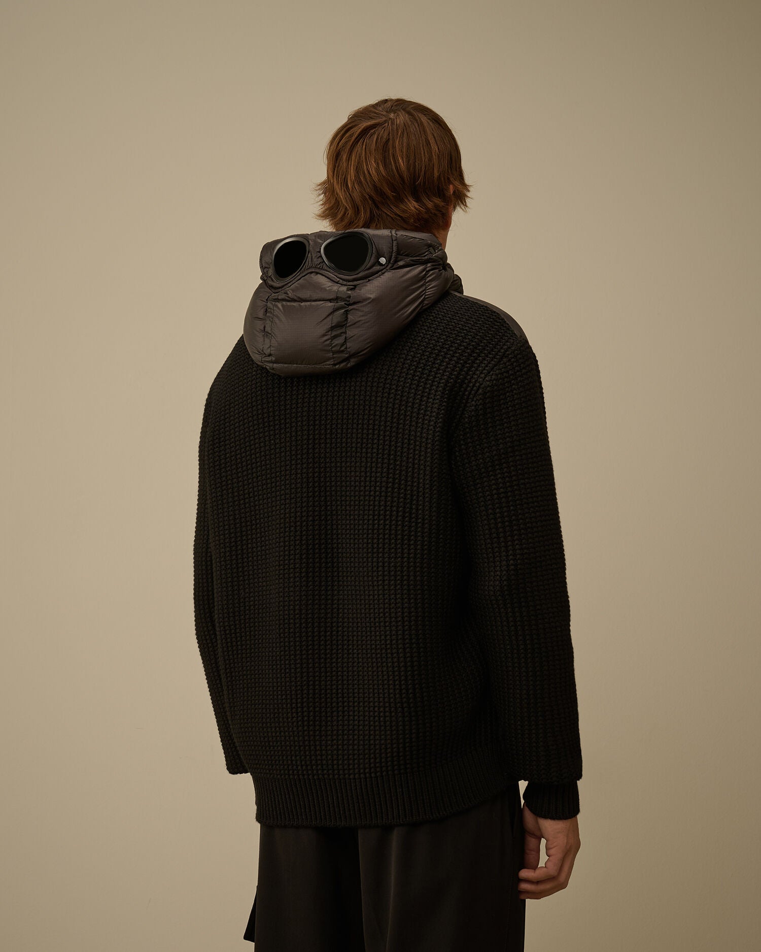 Pull à fermeture à glissière confectionné en laine mérinos extrafine Contient du D.D. Shell. Le pull est doté de la capuche Goggle amovible et réglable emblématique de C.P. Company et de fermetures à glissière cachées sur les côtés. Finition avec poignets côtelés. Coupe régulière.